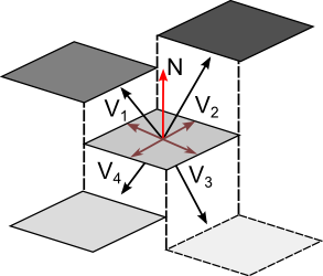 Screen space AO illustration using an isometric view of the framebuffer. Neighbouring pixels are sampled and their 3D view-space positions will either be in front or behind the pixel being tested. V1 and V2 will provide AO contributions as they are in front, but V3 and V4 are behind and are therefore excluded.